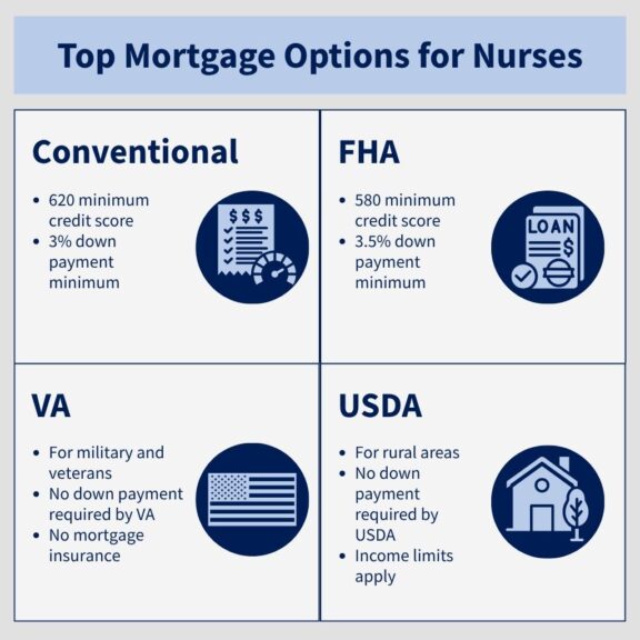 - Multiple home loans for nurses exist, including FHA, VA, USDA, and conventional loans.